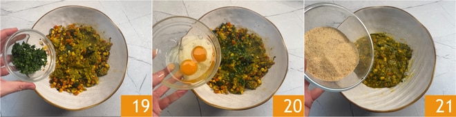 Parfumez avec du persil 19, puis ajoutez les œufs 20 et mélangez. Enfin, ajoutez la chapelure 21.
