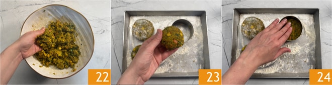 Mélangez à nouveau jusqu'à obtenir un mélange modelable 22. Farinez un plateau sur lequel vous souhaitez façonner vos hamburgers. Avec vos mains légèrement humides ou huilées, prenez 90 g de mélange et formez une grosse boulette 23. Placez-la à l'intérieur d'un emporte-pièce de 8 cm de diamètre et aplatissez-la pour former un médaillon 24, ou vous pouvez les former à la main.