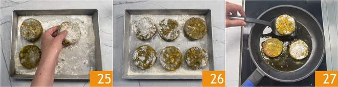 Tournez-le pour fariner également l'autre côté 25. Au final, vous devriez obtenir 6 hamburgers 26. Dans une poêle antiadhésive, faites chauffer un filet d'huile et faites cuire les hamburgers pendant 2-3 minutes de chaque côté, en les retournant délicatement 27.