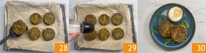 Une fois cuits, placez-les sur du papier absorbant pour éliminer l'excès d'huile 28 et assaisonnez-les avec une pincée de sel 29. Vos hamburgers de légumes sont prêts à être dégustés 30 : accompagnez-les par exemple de roquette et d'une sauce au yaourt.