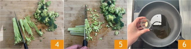 Éliminez les parties extérieures de la tige 4 et coupez-la d'abord en bâtonnets puis en dés d'environ 5-7 mm 5. Dans une poêle antiadhésive, versez un filet d'huile et ajoutez l'ail 6.