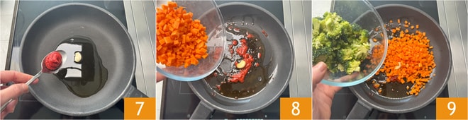 Ajoutez le concentré de tomate 7 et faites revenir pendant quelques minutes. Ajoutez ensuite les carottes 8, les brocolis 9.