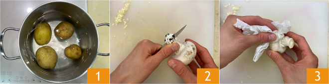 Pour préparer l'hamburger végétarien d'automne, commencez par faire bouillir les pommes de terre en partant d'eau froide pendant environ 30 minutes après ébullition, ou jusqu'à ce qu'elles soient assez tendres pour pouvoir être facilement piquées avec une fourchette 1. Pendant ce temps, hachez l'ail 1, puis passez au nettoyage des champignons : retirez la base 2 et essuyez-les délicatement avec du papier absorbant humidifié 3.