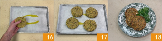Transférez les burgers sur une plaque tapissée de papier sulfurisé légèrement huilé 16, puis assaisonnez également la surface et faites cuire dans un four statique préchauffé à 200 °C pendant environ 20 minutes 17. Vos hamburgers végétariens d'automne sont prêts à être dégustés 18 !