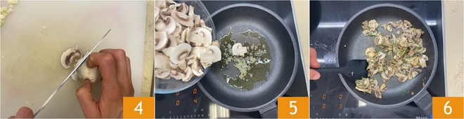 Coupez les champignons de Paris en fines tranches 4 et allez aux fourneaux. Dans une poêle, chauffez un filet d'huile avec l'ail, puis ajoutez les champignons 5 et une pincée de sel. Aromatisez avec le persil haché et faites sauter les champignons pendant environ 5 minutes. Une fois cuits, hachez les champignons avec un couteau.