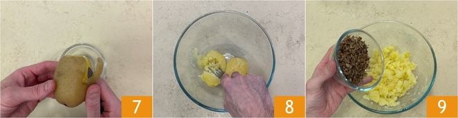 À ce stade, les pommes de terre sont cuites : pelez-les 7 et écrasez-les dans un bol 8. Ajoutez les champignons hachés à la main 9.