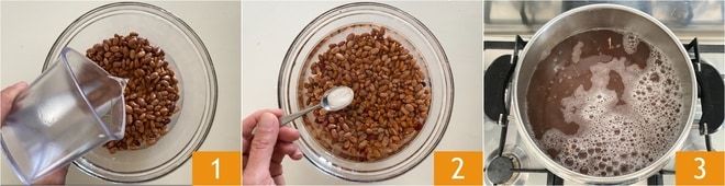 Pour préparer les haricots à la mexicaine, commencez par mettre les haricots secs dans un bol avec de l'eau froide 1, ajoutez une pincée de bicarbonate 2 et laissez-les tremper pendant toute une nuit. Le lendemain, versez les haricots égouttés dans une casserole d'eau bouillante et, lorsque l'ébullition reprend, égouttez-les à nouveau ; de cette façon, ils seront plus digestes.