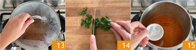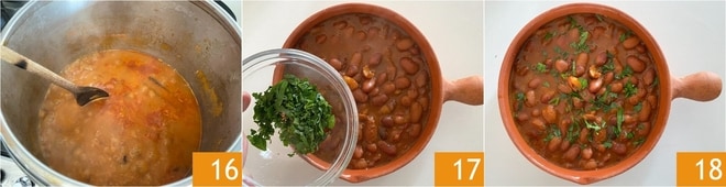 Faites cuire avec le couvercle pendant environ 3 heures à feu doux, en remuant de temps en temps et en ajoutant un peu d'eau si nécessaire 13. Pendant ce temps, hachez le persil 14. Une fois le temps de cuisson écoulé, rectifiez l'assaisonnement en sel 15.