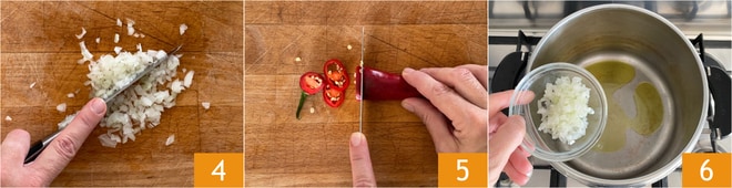 Nettoyez et hachez finement l'oignon 4, puis coupez le piment en rondelles 5. Dans la même casserole où vous avez blanchi les haricots, versez l'oignon avec un généreux filet d'huile et faites-le revenir doucement 6.