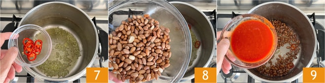Une fois l'oignon ramolli, ajoutez le piment 7 et laissez infuser. À ce stade, ajoutez les haricots 8 et faites-les dorer quelques minutes à feu vif, puis baissez le feu et versez la purée de tomates 9.