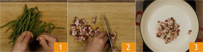 Pour préparer les haricots verts mijotés à la paysanne, vous devez d'abord laver les haricots et retirer les extrémités 1, puis couper le lard en lanières 2. Placez une casserole sur le feu, de préférence en fonte ou avec un fond épais, ajoutez le lard 3.