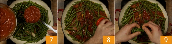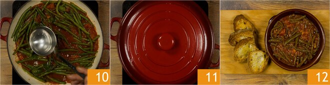 Ajoutez une louche d'eau chaude 10, couvrez la casserole avec un couvercle 11 et laissez cuire pendant environ 50 minutes, ou jusqu'à ce que les haricots soient tendres. Vérifiez que la préparation reste toujours humide, dans le cas contraire, ajoutez un peu d'eau chaude. Servez les haricots verts mijotés à la paysanne accompagnés de pain grillé 12.