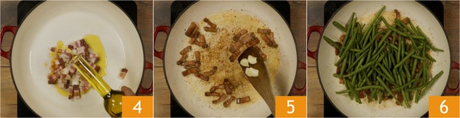 Versez un filet d'huile d'olive extra vierge 4. Faites bien dorer le lard. Presque à la fin de la dorure, ajoutez l'ail épluché, coupé en deux et sans germe 5. Après un instant, juste le temps de parfumer l'huile avec l'ail, ajoutez également les haricots verts préalablement nettoyés 6. Faites-les revenir à feu moyen en remuant fréquemment pendant quelques minutes.