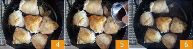 Laissez dorer environ 5 minutes à feu vif, puis retournez les hauts de cuisse 4 et déglacez avec le vin 5. Faites cuire à feu doux pendant environ 20 minutes 6, en ajoutant un peu d'eau si nécessaire.
