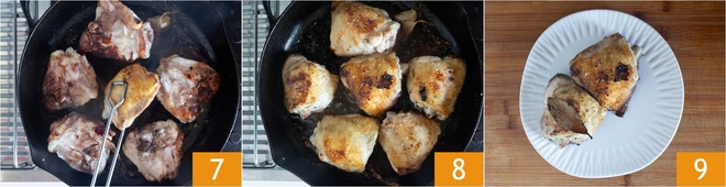 Tournez le poulet à nouveau et laissez-le dorer pendant 5 minutes 7. Assaisonnez de sel et de poivre 8, puis servez immédiatement vos hauts de cuisse de poulet à la poêle 9 !