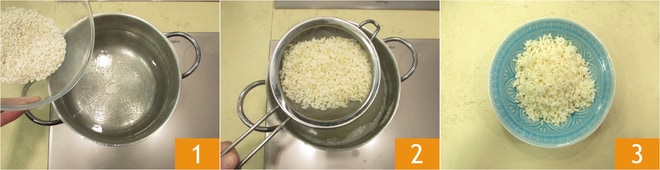 Pour préparer l'hosomaki végétarien, commencez par la cuisson du riz japonais. Rincez-le sous l'eau froide courante et faites-le bouillir dans de l'eau salée pendant 9 minutes. 1. Égouttez le riz 2 et assaisonnez-le avec le vinaigre de riz, puis laissez-le tiédir à température ambiante 3.