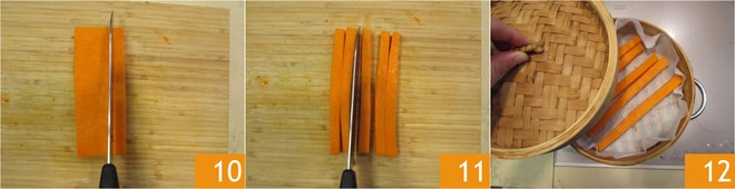 Entre-temps, coupez la courge de manière à obtenir 4 rectangles de 21 cm de long et d'environ 1 cm de largeur et hauteur 10 11. Mettez les rectangles de courge dans le même cuit-vapeur et laissez-les cuire pendant 7 minutes 12.