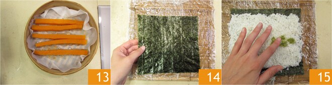 À la fin de la cuisson, laissez refroidir la courge 13. À ce stade, placez l'algue sur le tapis spécial 14 pour sushi et disposez dessus le riz, en veillant à atteindre le bord du côté court et à laisser environ 1 cm de vide sur les deux côtés longs, en l'aplatissant bien avec les mains. Au centre, étalez avec le doigt une bande de wasabi 15.