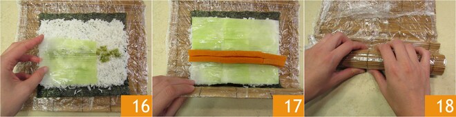 Placez sur toute la surface du riz 4 feuilles de poireau 16 et ensuite placez au centre 2 rectangles de courge 17. Maintenant, enroulez votre hosomaki en partant du bas, serrez bien avec les mains jusqu'à ce que le rouleau soit bien compact 18.