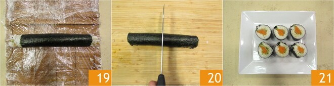À ce stade 19, transférez-le sur une planche à découper et coupez-le d'abord en deux, puis en 6 morceaux 20. Votre hosomaki végétarien est prêt à être servi, si vous le souhaitez avec de la sauce soja 21.