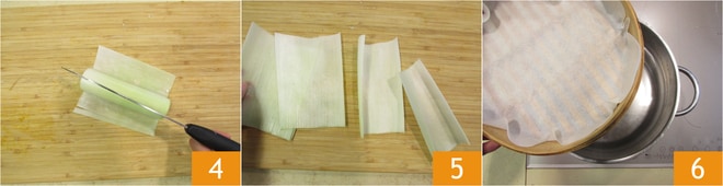 Incisez le poireau avec un couteau dans le sens de la longueur 4 et épluchez-le 5. Préparez un cuit-vapeur avec un panier tapissé de papier sulfurisé 6.
