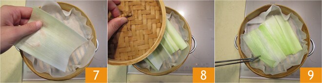 Placez ici les feuilles de poireau 7 et faites cuire pendant 5 minutes avec le couvercle 8. Une fois cuites 9, transférez-les sur une assiette pour refroidir.