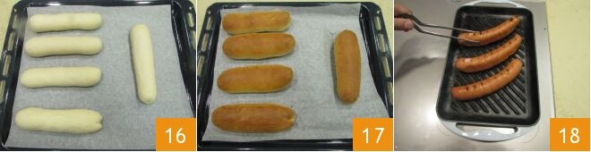 Laissez lever environ 40 minutes à température ambiante 16 et ensuite cuisez-les dans un four statique préchauffé à 180°C pendant 20-25 minutes ou dans un four ventilé à 160°C pendant 10-15 minutes jusqu'à ce qu'ils obtiennent une coloration dorée 17, en vous rappelant de les tourner de temps en temps dans le four pour permettre une cuisson uniforme. Lorsqu'ils sont cuits, sortez-les du four, laissez-les refroidir complètement, puis coupez-les en deux sur le côté long pour former une sorte de poche. Pendant ce temps, continuez avec la préparation des saucisses. Prenez une grille et cuisez les saucisses pendant 10 minutes à feu vif, en les retournant de temps en temps pour qu'elles cuisent uniformément 18. Vous verrez la saucisse griller et acquérir les mêmes rayures que la grille.