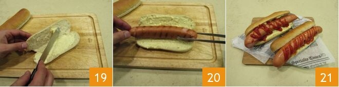 Tartinez ensuite la mayonnaise à l'intérieur de la poche 19. Insérez ensuite dans la poche du pain une saucisse cuite 20 et comme dernier geste, saupoudrez d'abondant ketchup 21. Vos hot dogs sont maintenant prêts à être dégustés!