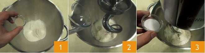 Pour préparer les hot dogs, commencez par la préparation du pain. Dans le bol du robot culinaire, versez la farine tamisée, la levure sèche 1 et l'eau à température ambiante en filet 2. Pétrissez quelques minutes les ingrédients avec le crochet. Ajoutez ensuite dans le bol du robot le sucre 3 et continuez de pétrir pour permettre aux ingrédients de se mélanger.