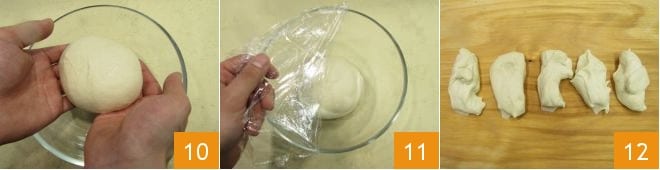 Placez dans un grand bol 10 et laissez lever couvert d'un film plastique dans un four éteint avec la lumière allumée pendant 2-3 heures, jusqu'à ce qu'il ait doublé de volume 11. Une fois la pâte levée, transférez-la sur le robot culinaire et divisez-la en 5 parts égales 12.