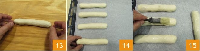 Ensuite, prenez un morceau et façonnez-le brièvement pour lui donner une forme allongée (environ 15 cm) 13. Répétez l'opération pour tous les cinq morceaux. Disposez-les ensuite sur une plaque recouverte de papier sulfurisé à au moins 5 cm de distance les uns des autres 14. Badigeonnez légèrement vos petits pains avec du lait 15.