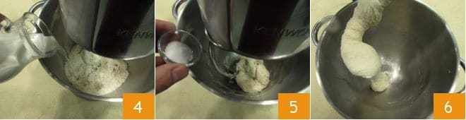 Ajoutez maintenant peu à peu le lait à température ambiante 4 ; lorsqu'il sera absorbé, versez le sel 5. Continuez de pétrir avec le crochet jusqu'à obtenir une pâte souple et élastique ; la pâte devra se détacher facilement des parois du robot 6.