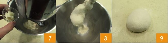 Enfin, ajoutez le beurre en morceaux, peu à peu, en attendant qu'un morceau soit absorbé avant de continuer avec l'autre 7 et continuez à pétrir pour l'incorporer également aux autres ingrédients jusqu'à obtenir une pâte souple et homogène 8. Retournez la pâte sur un plan de travail légèrement beurré et donnez-lui une forme sphérique 9.