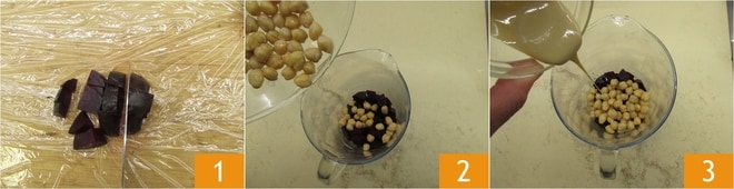 Pour préparer l'houmous de betterave, commencez par mettre des gants et enveloppez une planche à découper dans du film plastique. La betterave a tendance à tacher, il est donc bon de faire attention. Puis, coupez-la en cubes 1 et transférez-la dans un récipient haut et étroit. Ajoutez également les pois chiches égouttés 2 et le tahini 3.