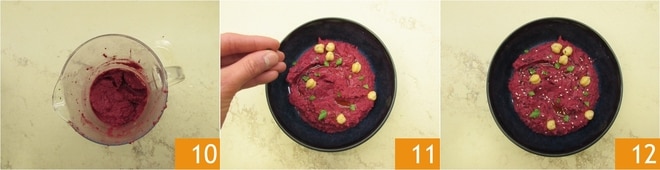 Vous devez obtenir une consistance lisse, crémeuse et dense 10. Transférez maintenant dans un petit bol, décorez avec des pois chiches précuits et des graines de sésame 11. L'houmous de betterave est prêt à être servi 12.