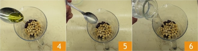 Ajoutez ensuite l'huile 4, le jus de citron 5 et l'eau 6.