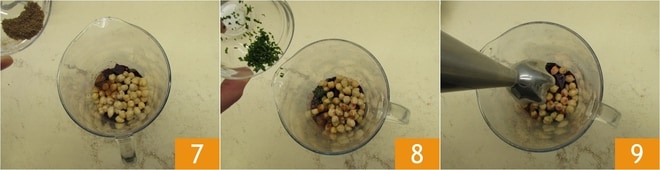 Ajoutez également les épices en poudre : cumin, paprika et piment 7. Versez le persil préalablement haché 8 et mixez le tout avec un mixeur plongeant 9.