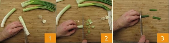 Pour préparer les huîtres au champagne et ciboule, commencez par nettoyer les ciboules. Incisez et éliminez la partie inférieure puis la touffe en coupant à l'endroit de l'attache entre la partie verte (ne la jetez pas), qui est plus coriace, et celle blanche où commence la partie plus tendre. Incisez verticalement cette dernière et enlevez la pellicule, si nécessaire rincez l'intérieur 1. Enfin, émincez finement et mettez dans un bol 2. Pendant ce temps, nettoyez les tiges de ciboule que vous avez mises de côté. Puis coupez en morceaux de 3-4 cm 3.