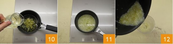 Une fois attendri, versez le champagne 10 et continuez la cuisson pendant encore 10 minutes 11. À la fin de la cuisson, versez dans le gobelet d'un mixeur plongeant 12,