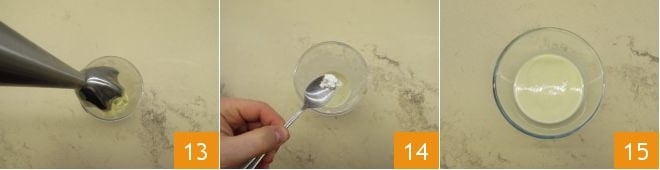 mixez 13 puis ajoutez la fécule de maïs et actionnez à nouveau le mixeur pour incorporer la poudre 14 obtenant ainsi une purée lisse ; versez dans un récipient et laissez tiédir 15.
