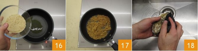Passez à la panure : dans une petite poêle, chauffez un peu d'huile et ajoutez la chapelure 16. Laissez griller quelques minutes à feu vif en remuant de temps en temps pour éviter de brûler ; réservez 17. À ce stade, si ce n'est pas déjà fait, occupez-vous du nettoyage des huîtres. Aidez-vous d'une éponge métallique pour nettoyer la surface des huîtres en les rinçant sous un filet d'eau 18.