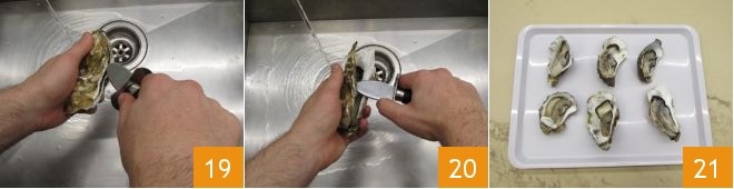 Puis avec un couteau spécial à lame fine et protection sur le manche, entrez à l'intérieur des bivalves 19 en faisant attention à ne pas déchirer le mollusque et à ne pas vous blesser 20. Disposez sur un plateau et occupez-vous de la composition 21.