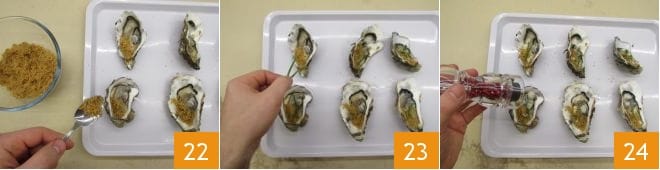 Versez un peu de panure sur un côté des huîtres ouvertes 22, puis décorez avec les tiges de ciboule bien égouttées 23, aromatisez avec une pincée de poivre rose moulu à la minute et quelques gouttes de crème préparées auparavant. Voici vos huîtres au champagne et ciboule prêtes : bon appétit 24 !
