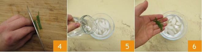 Avec la lame, entrez à l'intérieur pour diviser en deux moitiés dans le sens de la longueur et émincez pour obtenir des bâtonnets de quelques millimètres d'épaisseur 4. Versez-les dans un récipient avec de l'eau et de la glace 5 : de cette façon, ils resteront croquants 6