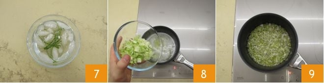 et finiront par être légèrement frisés 7. Réservez-les pour la décoration. Dans une petite casserole, faites fondre le beurre à feu doux et ajoutez la ciboule hachée 8, laissez cuire une dizaine de minutes en remuant de temps en temps 9.