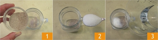 Pour réaliser l'iced ginseng au caramel, versez le café de ginseng soluble dans un bocal 1 avec une cuillère à café de sucre 2 et de l'eau chaude 3.