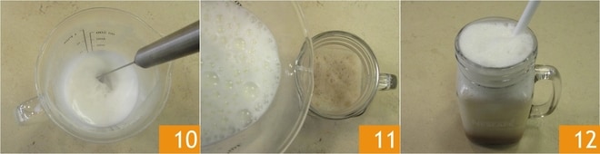 Laissez tiédir légèrement le lait, puis fouettez pendant quelques secondes avec le mousseur à lait jusqu'à obtenir une mousse 10. Remplissez le bocal avec le lait et la mousse 11 et dégustez votre iced ginseng au caramel 12 !