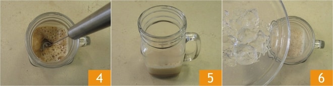 Mélangez légèrement le liquide avec le mousseur à lait 4. Laissez refroidir quelques minutes 5, puis ajoutez quelques glaçons 6.