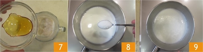 Ajoutez également le caramel 7. Pendant ce temps, versez le lait dans une petite casserole, ajoutez 2 cuillères à café de sucre 8 et faites fondre sur le feu 9.