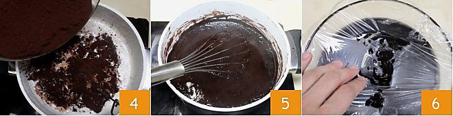 Maintenant, ajoutez le cacao mélangé au sucre dans le lait 4 et faites-les dissoudre en mélangeant avec un fouet pour éliminer les grumeaux 5. Ensuite, allumez le feu. Quand ça commencera à bouillir, baissez au minimum et laissez mijoter pendant 10 minutes. Une fois prêt, versez le chocolat dans un bol et couvrez-le d'un film alimentaire au contact 6, laissez-le refroidir à température ambiante puis mettez-le au frigo pendant 2 heures pour qu'il s'épaississe.